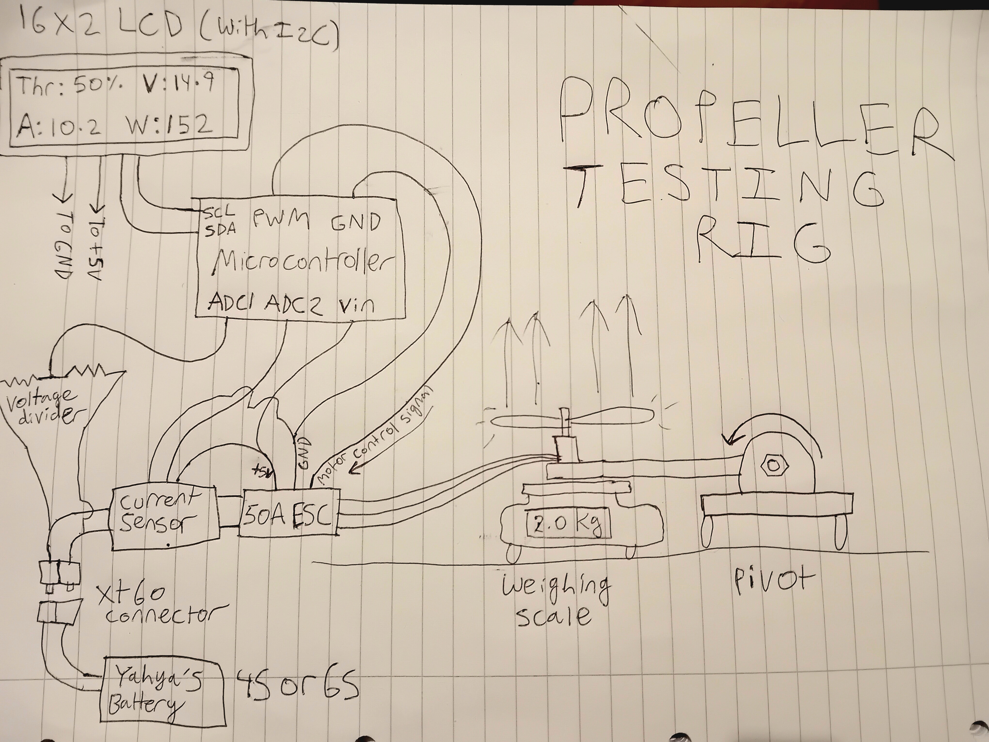 I we could just measure the actual thrust generated and power used and then divide the thrust by the power we get efficiency in grams/watt which means we can reliably compare component choices with real world data. When I showed my schematic to people I don't think they took me seriously. But I was dead serious. And I actually built it.