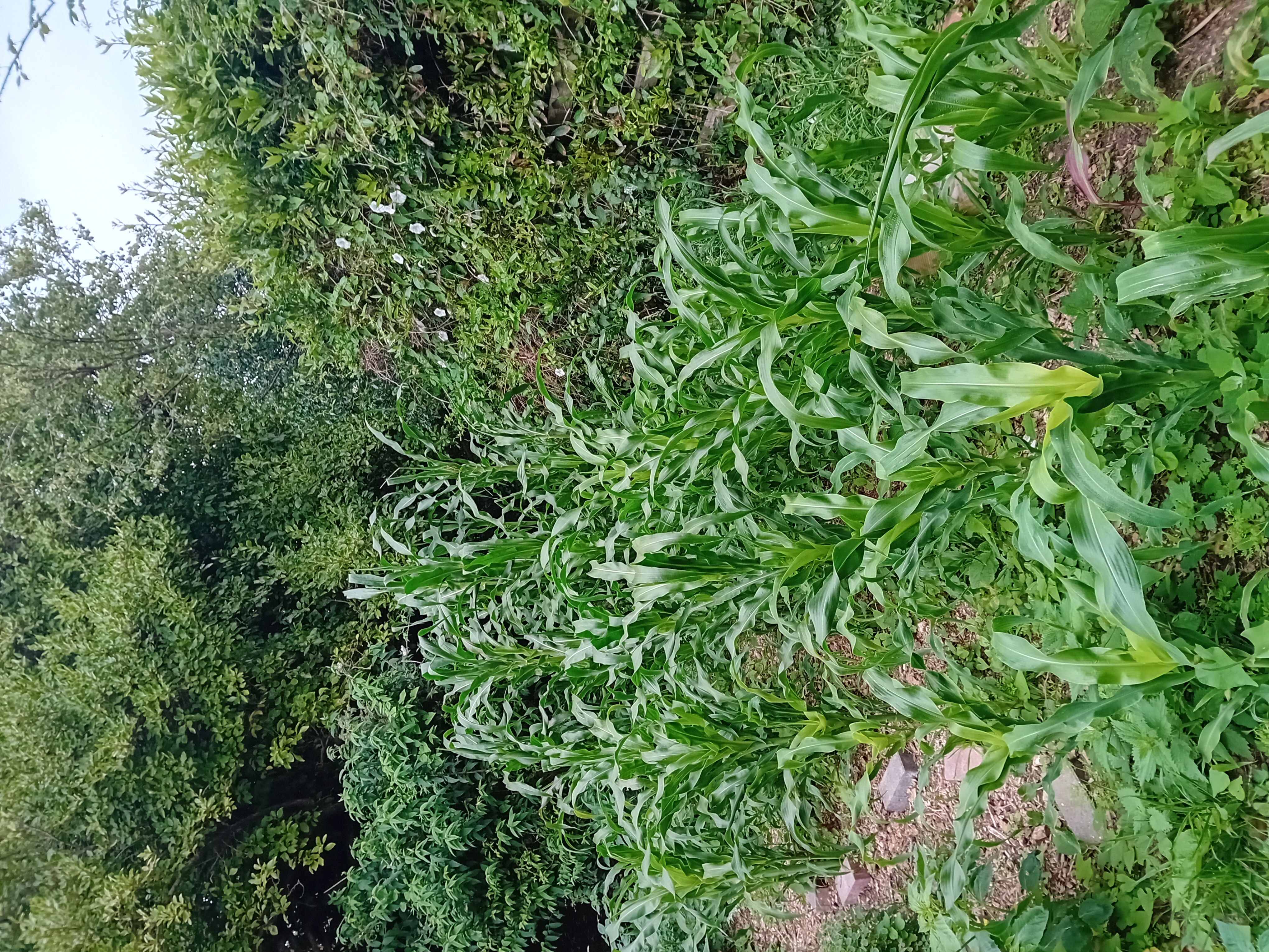 It is mid summer and the corn is green and healthy and growing very quickly. The weeds are a pain and they keep coming back, but as the corn grows bigger their light gets more and more starved.
